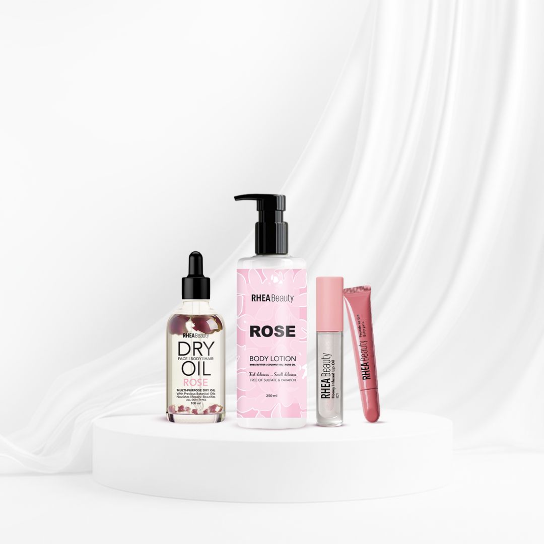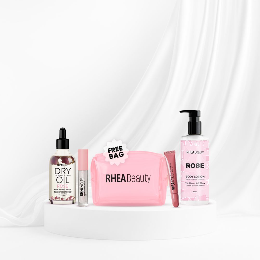 RHEA Beauty Rose Bundle – Indulge in the ultimate self-care set with our best-selling Rose Dry Oil, Rose Body Lotion, Lip Oil, and Lip Balm, beautifully packed with a FREE pink RHEA Beauty bag. This luxurious bundle deeply hydrates, nourishes, and leaves your skin glowing with a fresh rose scent. Perfect for daily use and gifting.