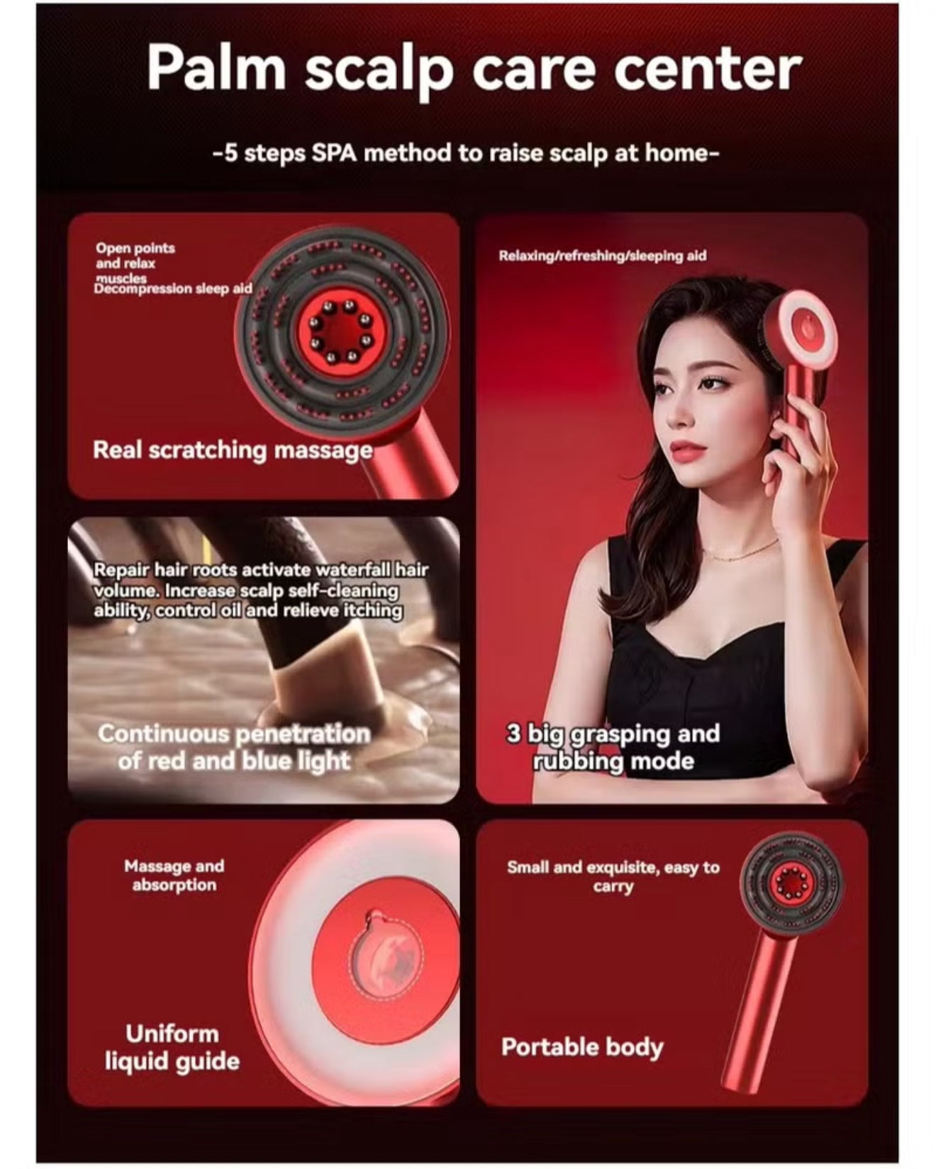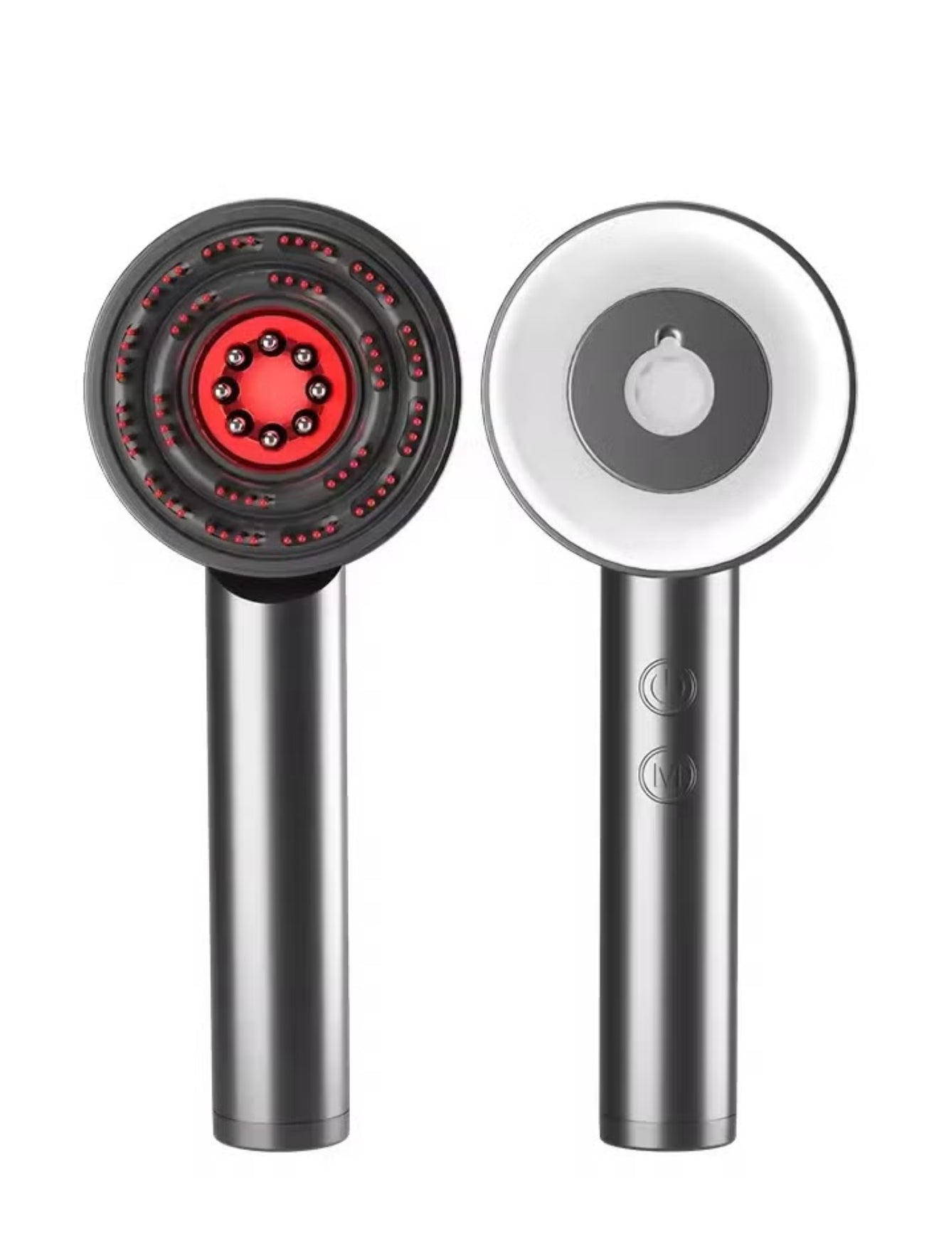 Hair Comb Massage with Red and Blue Light – Medicated Comb for Hair and Skin, Anti-Hair Loss Solution Revitalize your scalp and stimulate healthy hair growth with our Hair Comb Massage featuring advanced red and blue light therapy. This innovative device is designed to address hair loss, improve scalp health, and rejuvenate both hair and skin through a soothing, medicated massage. Key Features: Red and Blue Light Therapy: This advanced hair comb is equipped with two therapeutic light wavelengths. The red light stimulates blood circulation in the scalp, promoting hair follicle regeneration and encouraging hair growth. The blue light has anti-inflammatory properties, helping to reduce scalp irritation, dandruff, and oil build-up, providing a calming effect on the skin. Anti-Hair Loss Treatment: Specially designed to combat hair thinning and loss, this comb works by invigorating the scalp and strengthening hair at the roots. The combination of red light therapy and massaging action revitalizes dormant follicles, reducing the appearance of hair loss and encouraging new, healthy hair growth. Medicated Massage Action: Along with light therapy, the built-in massage function provides gentle stimulation to the scalp, improving circulation and enhancing the absorption of medicated hair treatments or oils. This dual-action approach helps nourish the scalp, relieve tension, and promote overall hair and skin health. Ergonomic and Easy to Use: The comb's lightweight, ergonomic design ensures comfortable handling and easy use. It’s portable and rechargeable, allowing for convenient use at home or on the go. USB Rechargeable: Powered by a rechargeable battery, this comb ensures hassle-free, cord-free use. Charge the comb easily via a USB connection, and enjoy consistent performance with every use. Multifunctional Use: In addition to hair care, this medicated comb can be used for facial and skin massage. The blue light therapy can soothe inflamed skin, reduce acne, and enhance overall skin tone, while the red light stimulates collagen production, promoting youthful skin. Safe and Effective for All Hair Types: Suitable for all hair types, including straight, curly, thick, and fine hair. The gentle light therapy and massaging action can be used on sensitive skin without irritation.